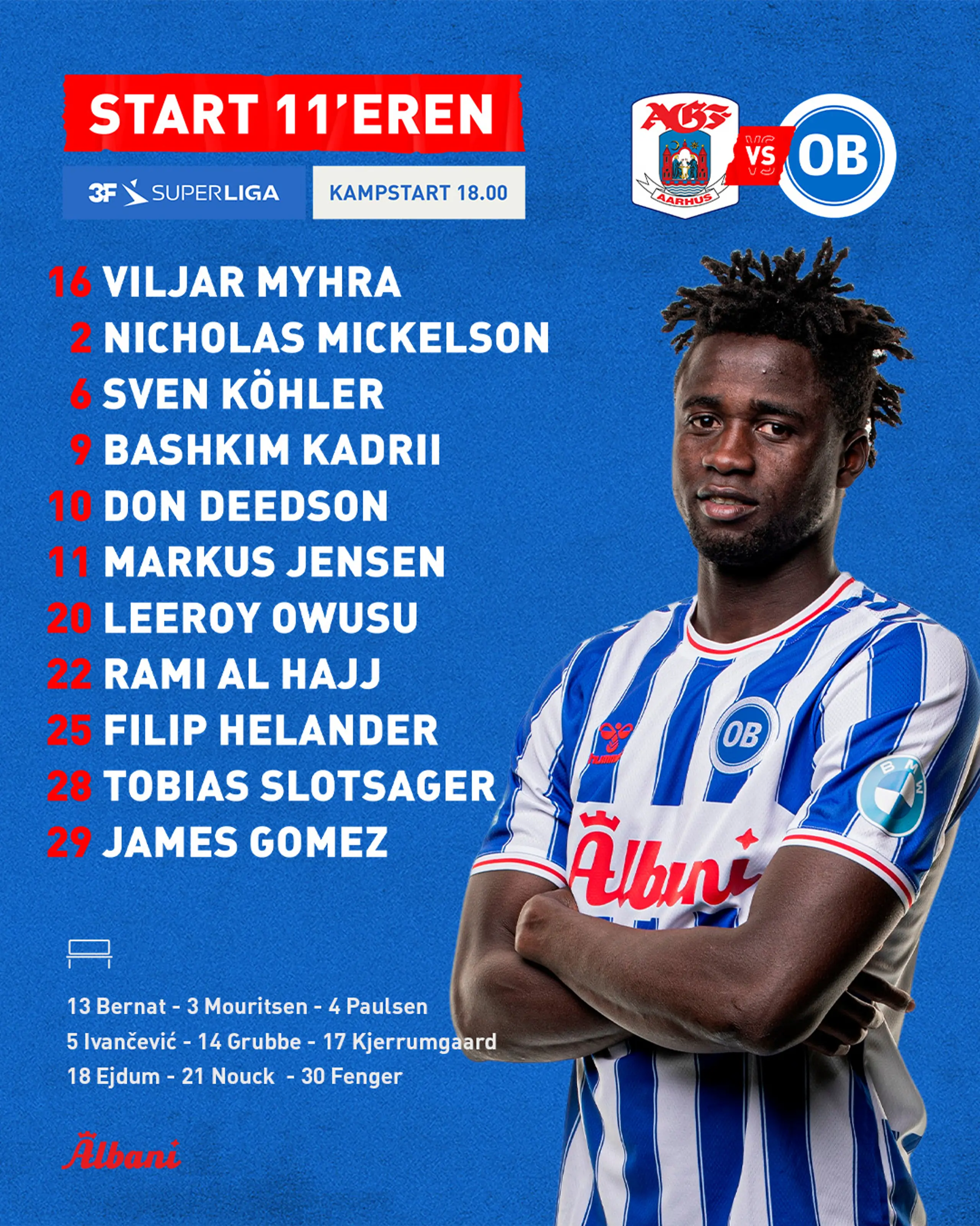 Sådan starter vi i provinsklassikeren 03.03.2024 16:00 James Gomez får sin stribede debut, når vi om en time går på banen i Aarhus. Flere nyheder Kvinder Ny duel mod FC Nordsjælland 07.11.2025 3F Superliga Truppen til fredagskampen 07.11.2025 3F Superliga - Den største selvtillidsbooster 06.11.2025 Nyt fra OB Carsten Lektonen er ny kommunikationschef i OB 06.11.2025