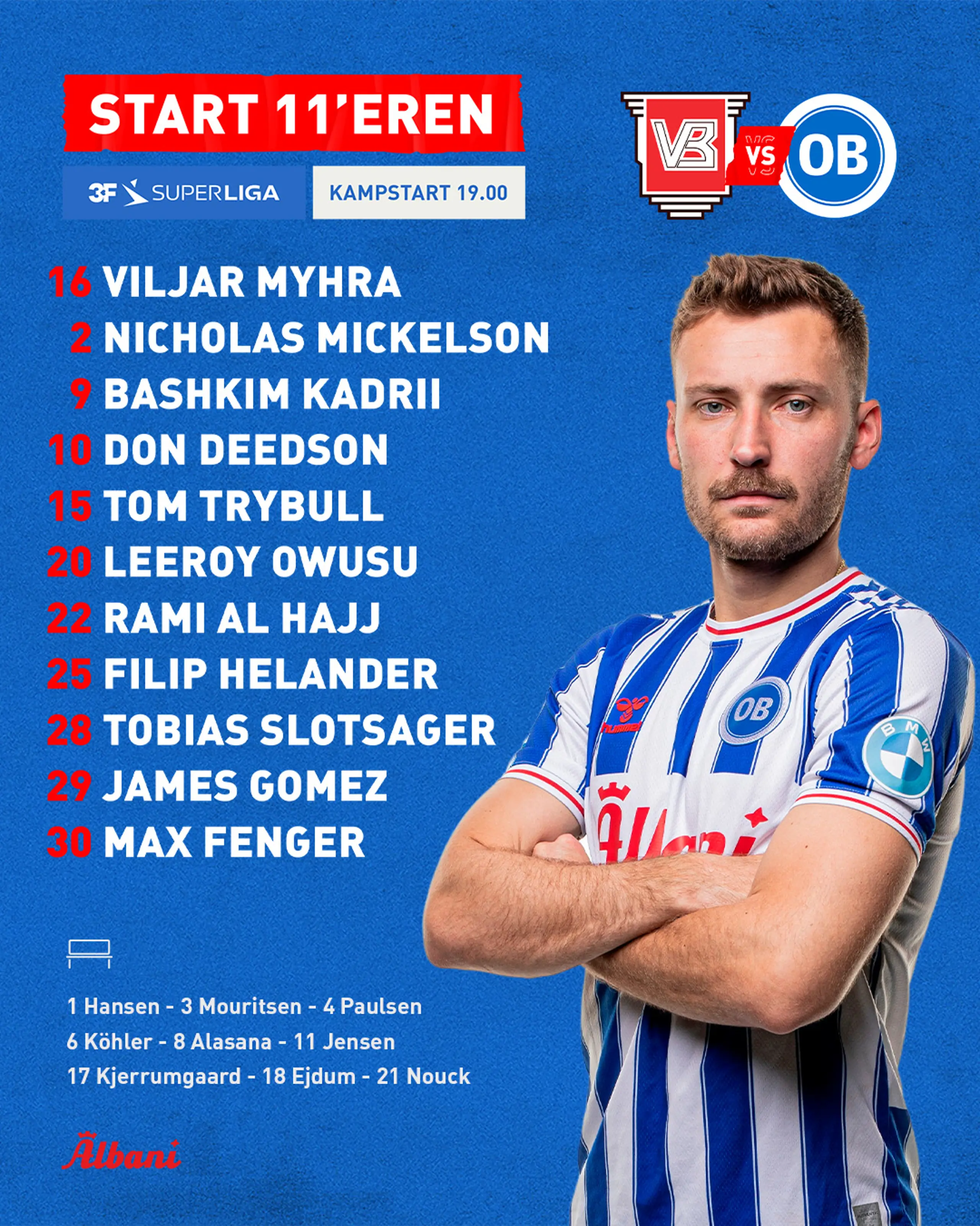 Sådan starter vi i Vejle 06.05.2024 16:00 Om en time går det løs på Vejle Stadion, hvor der venter 90 vigtige minutter. Og det er de her striber, der starter inde for OB. Flere nyheder 3F Superliga - Dejligt at være tilbage 23.11.2025 Kvinder Peer Lisdorf før sæsonens sidste A-ligakamp 21.11.2025 Nyhed Erfaren og kreativ Video- and Content Producer til OB’s kommunikationsafdeling 19.11.2025 Business Oplev OB fra VIP-siden - forkæl dig selv eller dine kolleger med en eksklusiv kampdag 19.11.2025