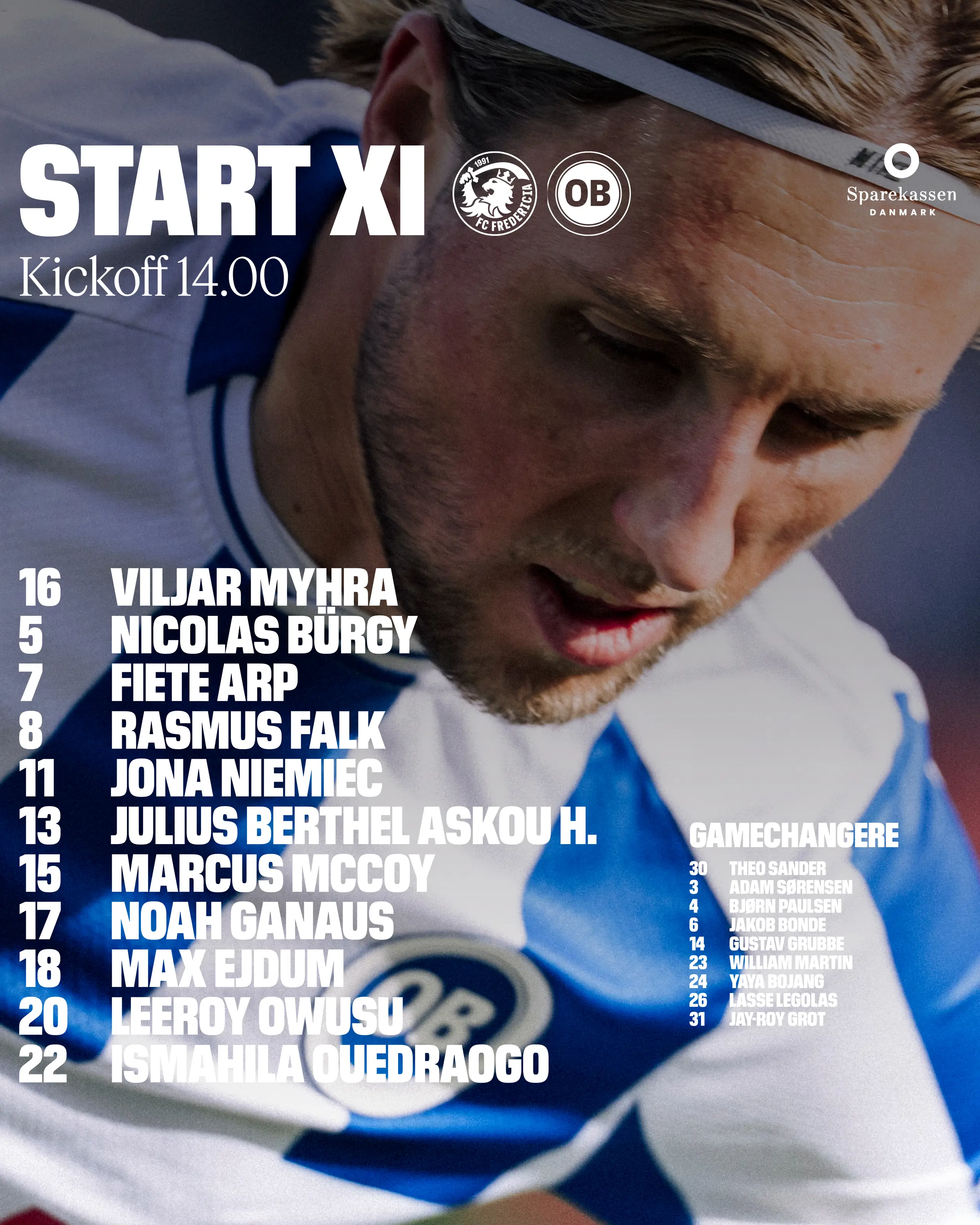 Startopstillingen i Fredericia 26.04.2026 10:50 Om lidt over en time går det løs på Monjasa Park, og Alexander Zorninger har nu offentliggjort hvilke striber, der starter inde for OB. Flere nyheder 3F Superliga Truppen der tager til Fredericia 26.04.2026 3F Superliga - Fansene giver os altid det sidste 25.04.2026 Kvinder - Vi tror på at vi kan lykkes 24.04.2026 3F Superliga Kom med til Energi Fyn Cup 2026 23.04.2026
