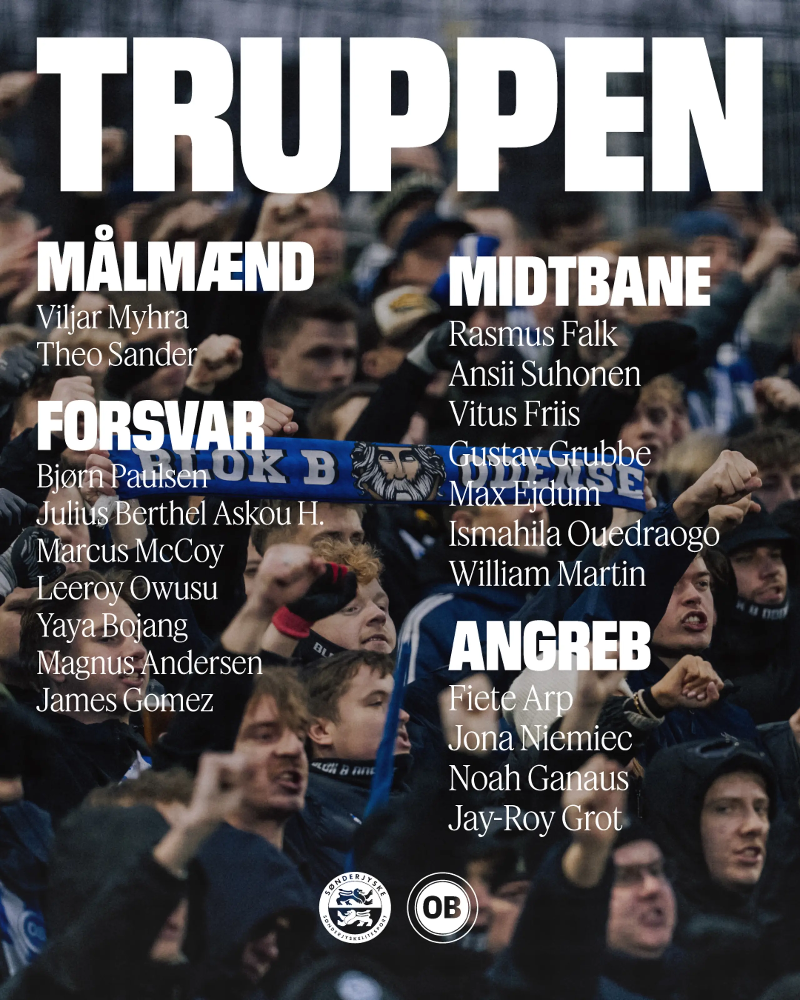Træneren har udvalg de 20 striber, som tager turen til Haderslev i Grundspillets sidste kamp. Her er Jay-Roy Grot tilbage, mens Adam Sørensen desværre må sidde over med en skade. Vi håber på at se en stærk opbakning i udebaneafsnittet.